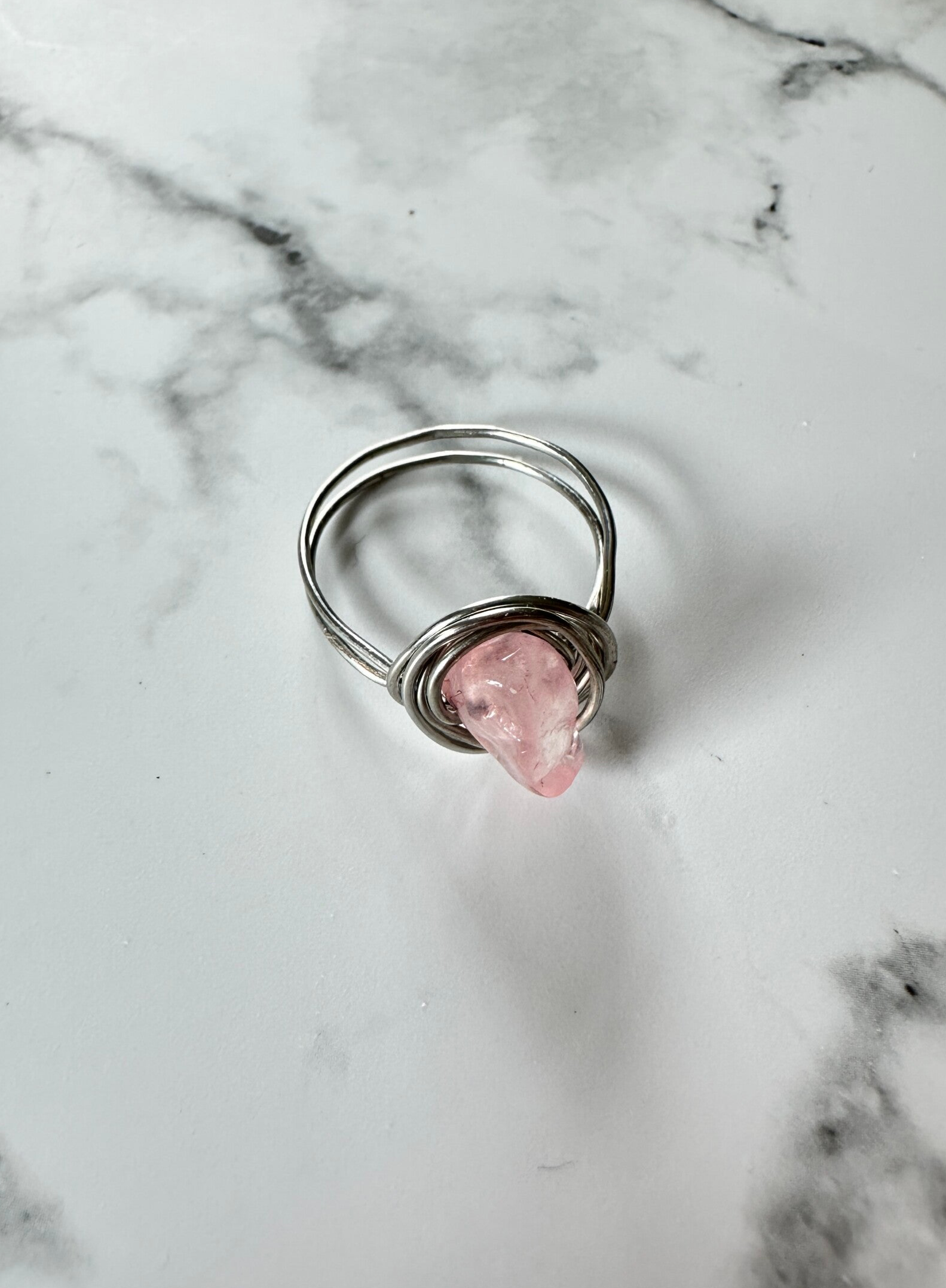 Ring uit gecoat koperdraad met roze kwarts-steen.