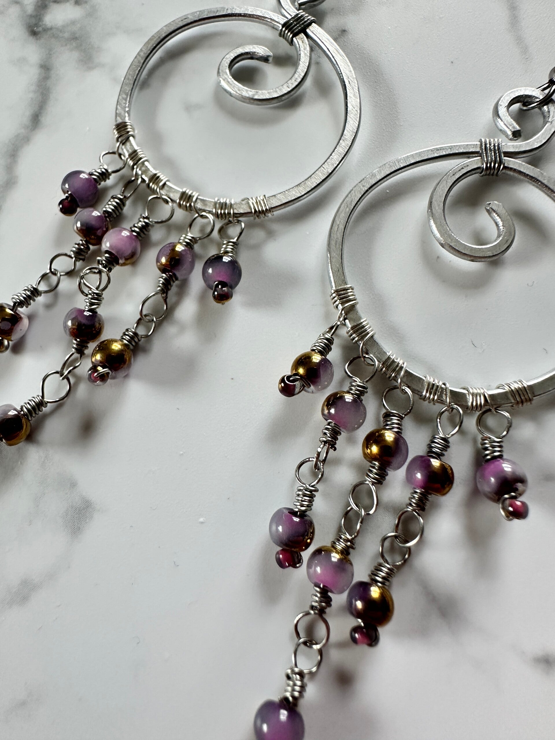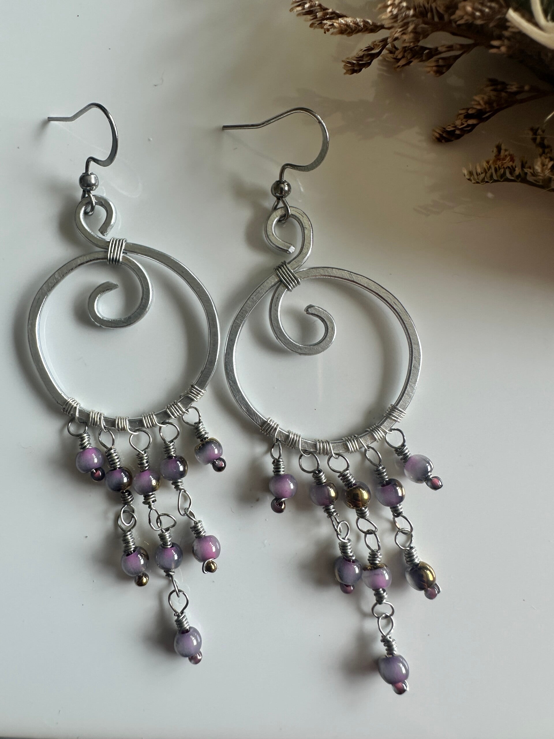 Frame uit gehamerd aluminiumdraad. Afgewerkt met kralen en koperdraad.