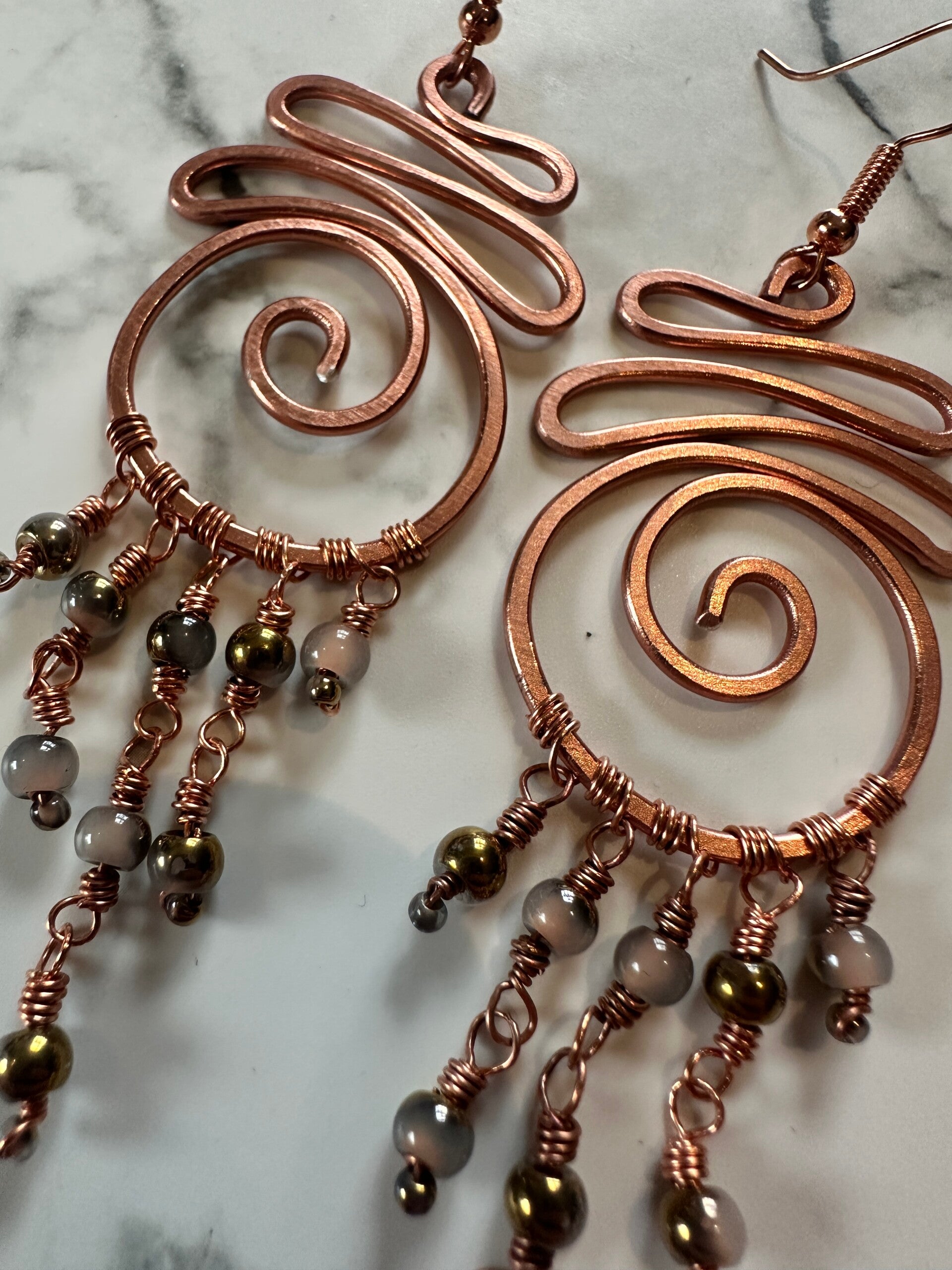 Oorbellen uit aluminiumdraad, afgewerkt met koperdraad en kralen.
