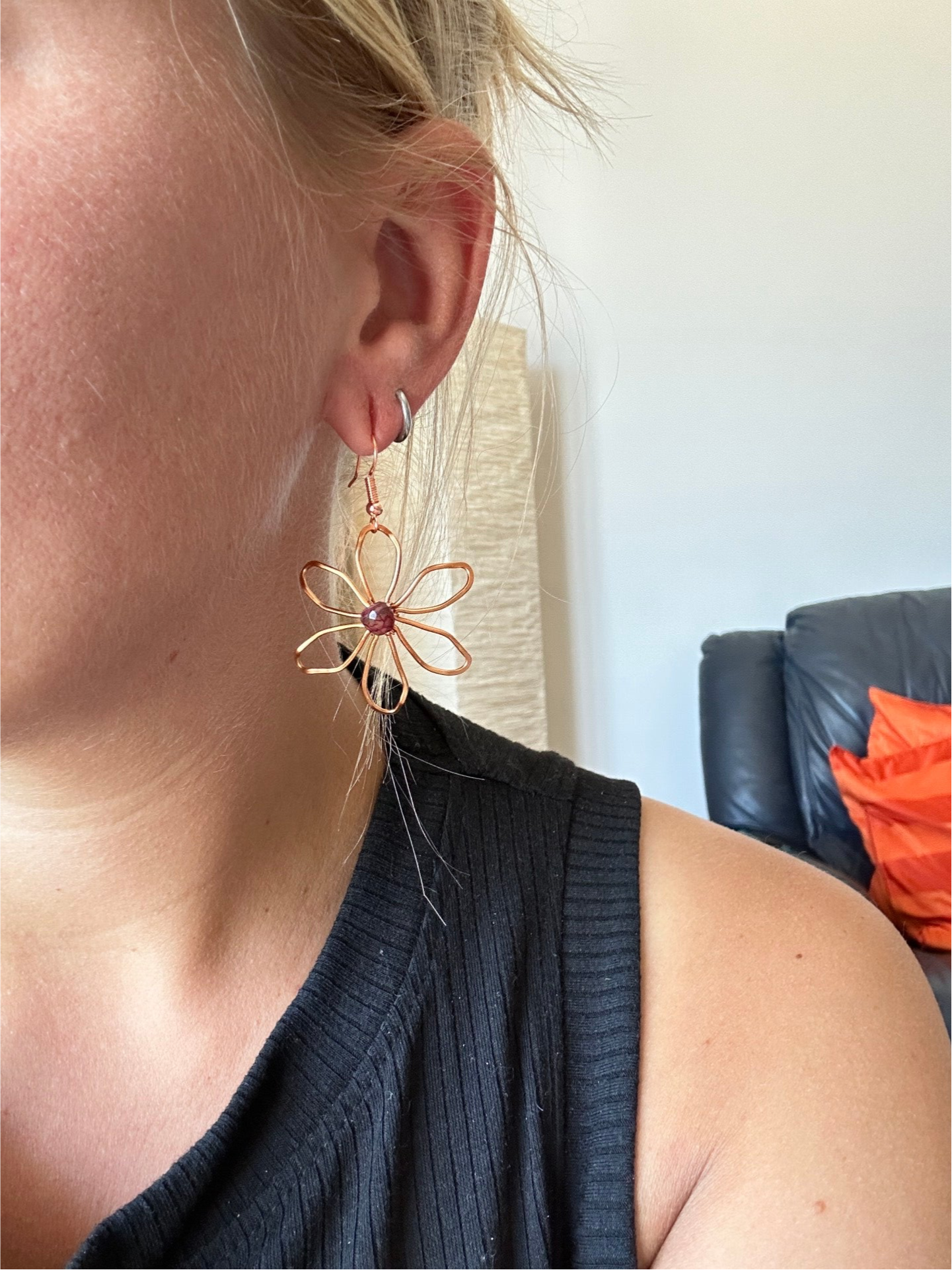 Oorbellen uit koperkleurige koperdraad, afgewerkt met drakenagaat-kraal.