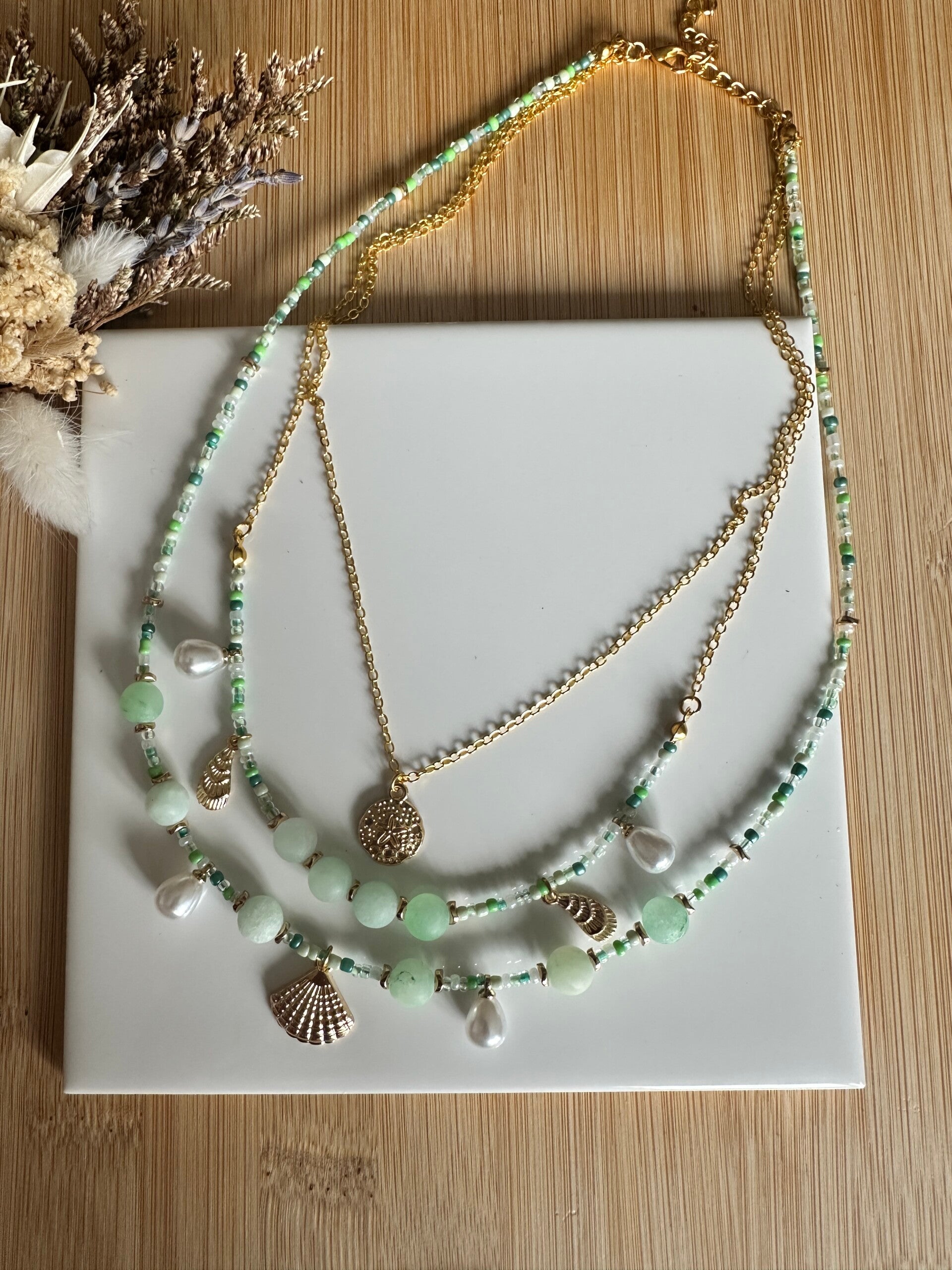 3-laags halsketting met kralen uit groene kwarts en gouden legering hangers.