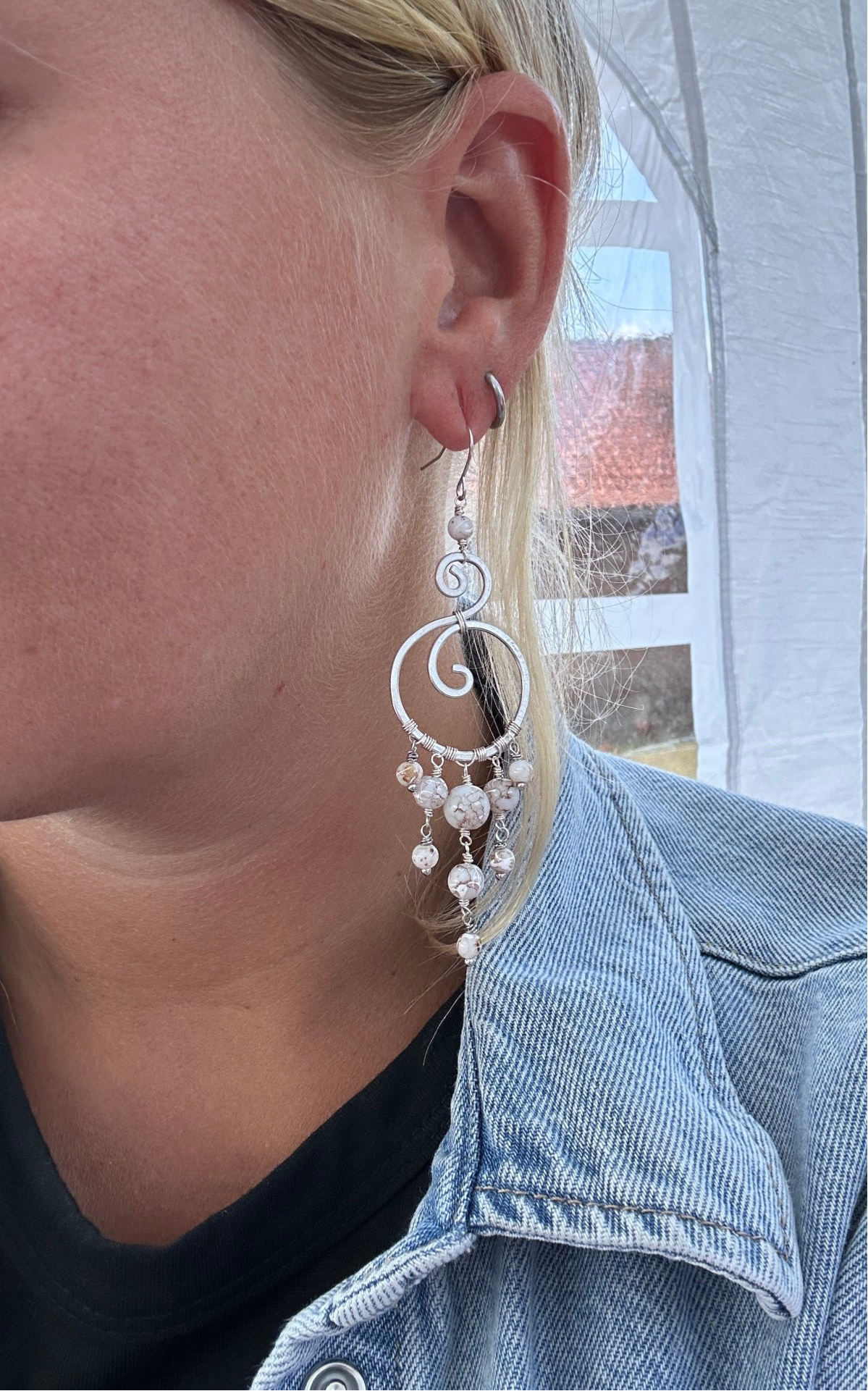 Oorbellen uit koperdraad met glaskralen met marmerprint.