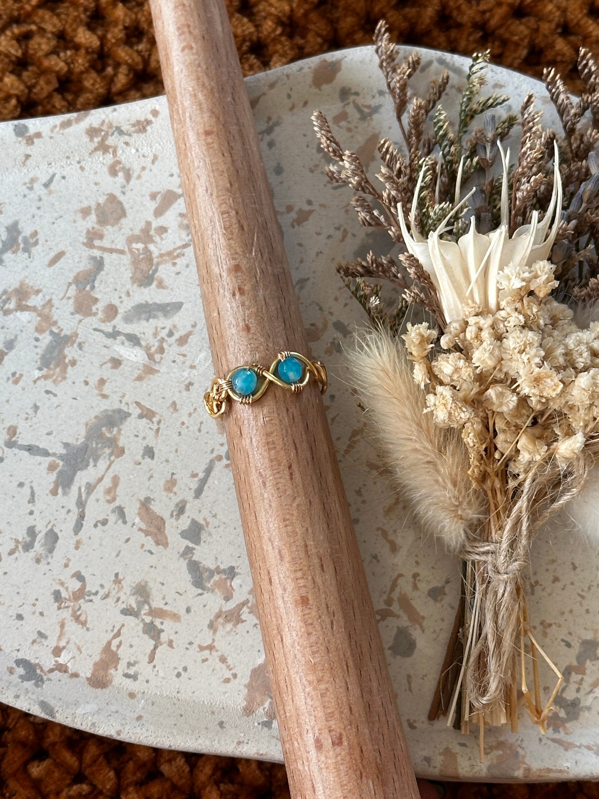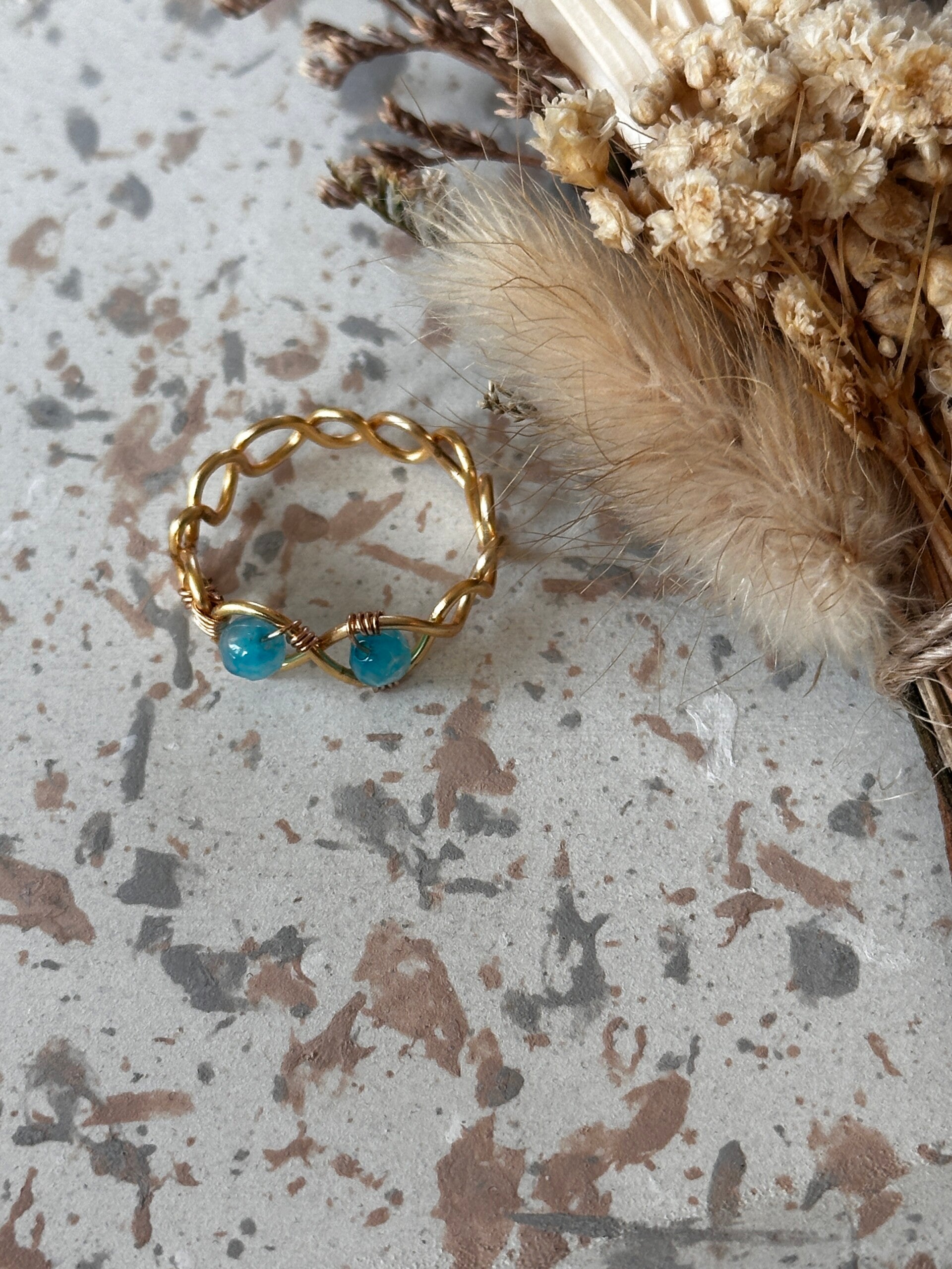 Ring uit gouden koperdraad afgewerkt met blauwe agaat-kralen.