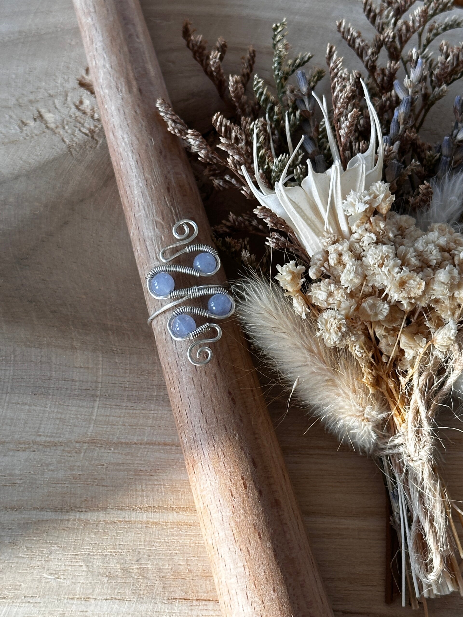 Ring uit zilveren koperdraad afgewerkt met blauwe aquamarijn-kralen.