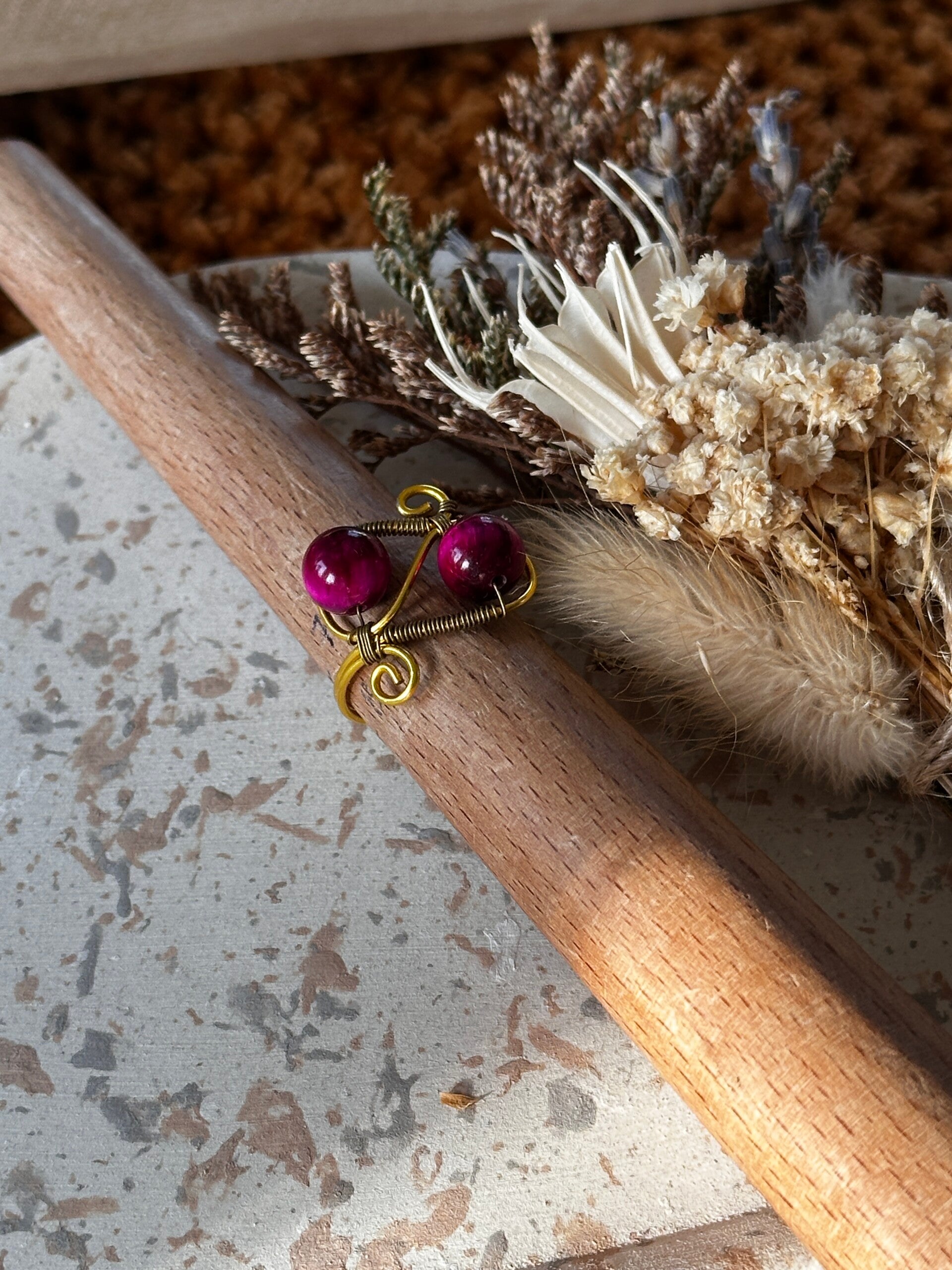 Ring uit gouden koperdraad afgewerkt met donkerroze tijgeroog-kralen (glas). Ringmaat 56 (US 7,5). Kan groter versteld worden.
