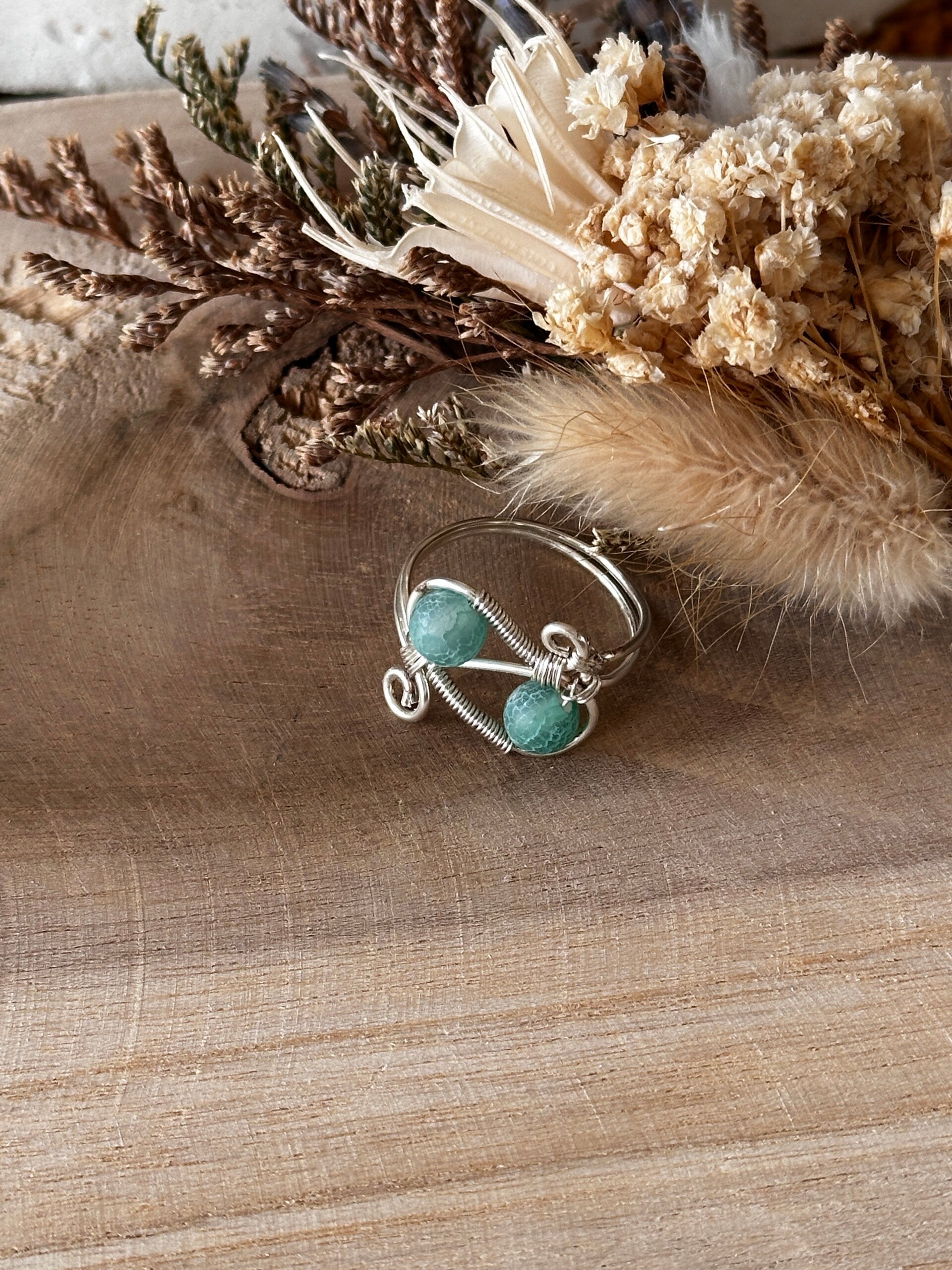 Ring uit zilveren koperdraad afgewerkt met matte groene agaat-kralen.