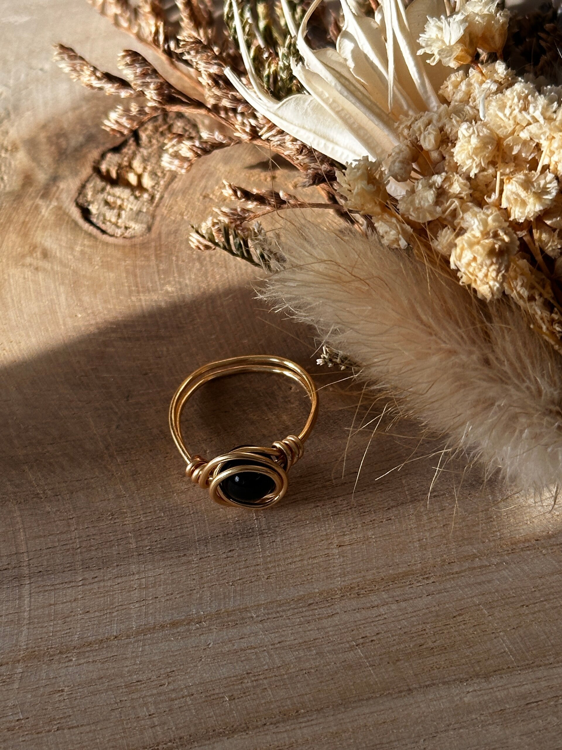Ring uit gouden koperdraad afgewerkt met zwarte onyx-steen.