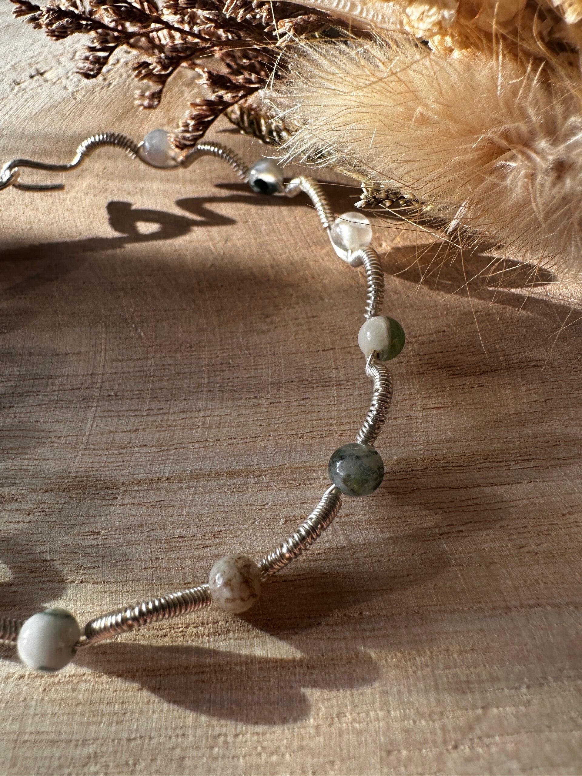 Armband uit zilveren koperdraad met boomagaat-kralen.