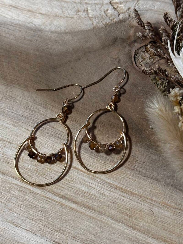 Oorbellen uit gouden koperdraad en bruine agaat-kralen.