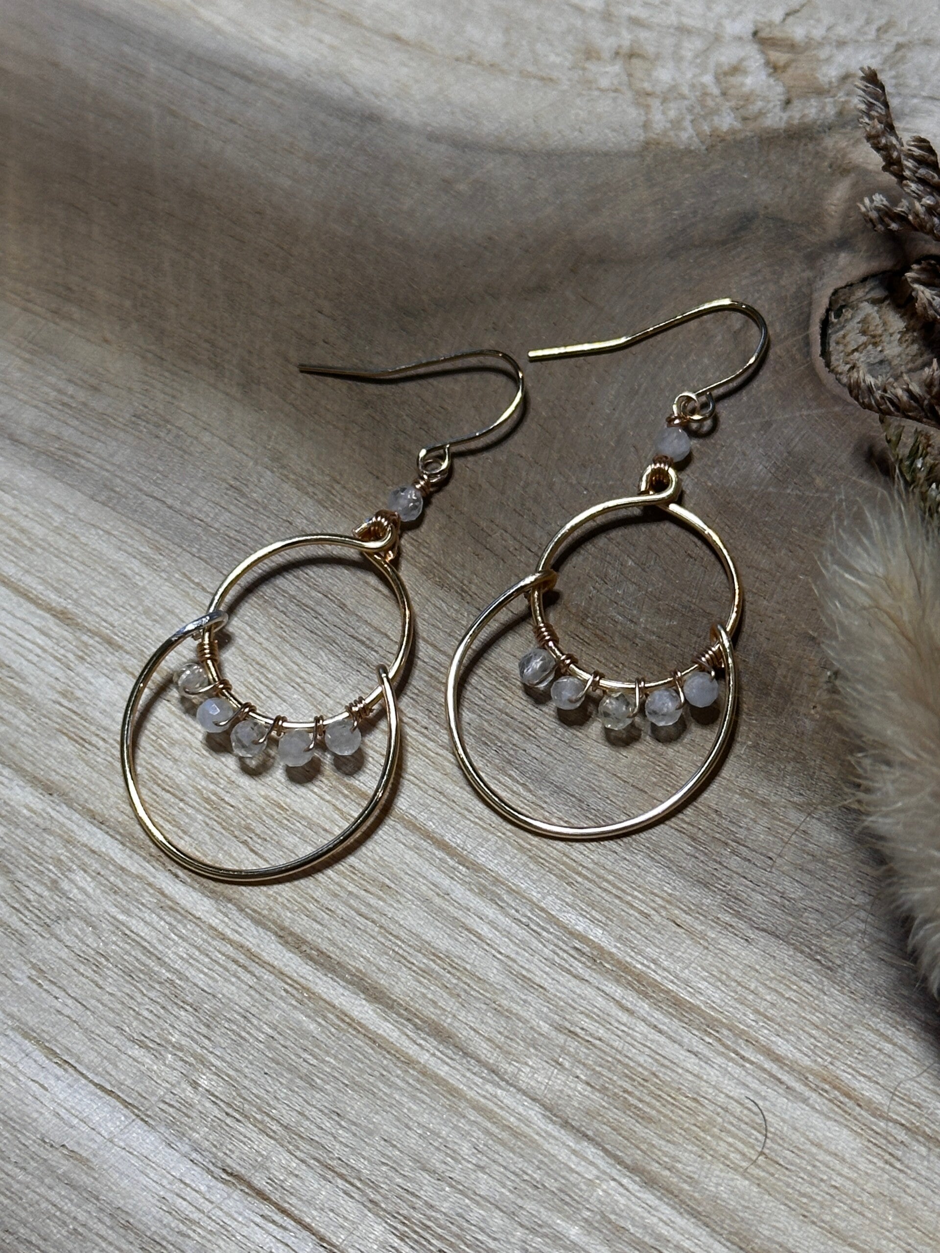 Oorbellen uit gouden koperdraad en witte topaas-kralen.