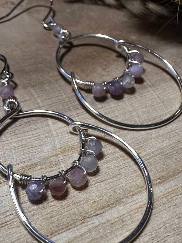 Oorbellen uit zilveren koperdraad en roze kunziet-kralen.