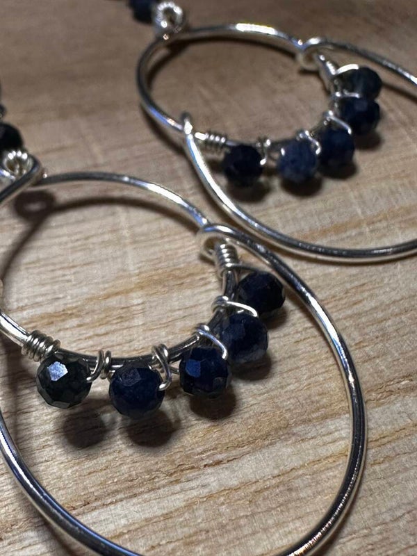 Oorbellen uit zilveren koperdraad en blauwe safier-kralen.