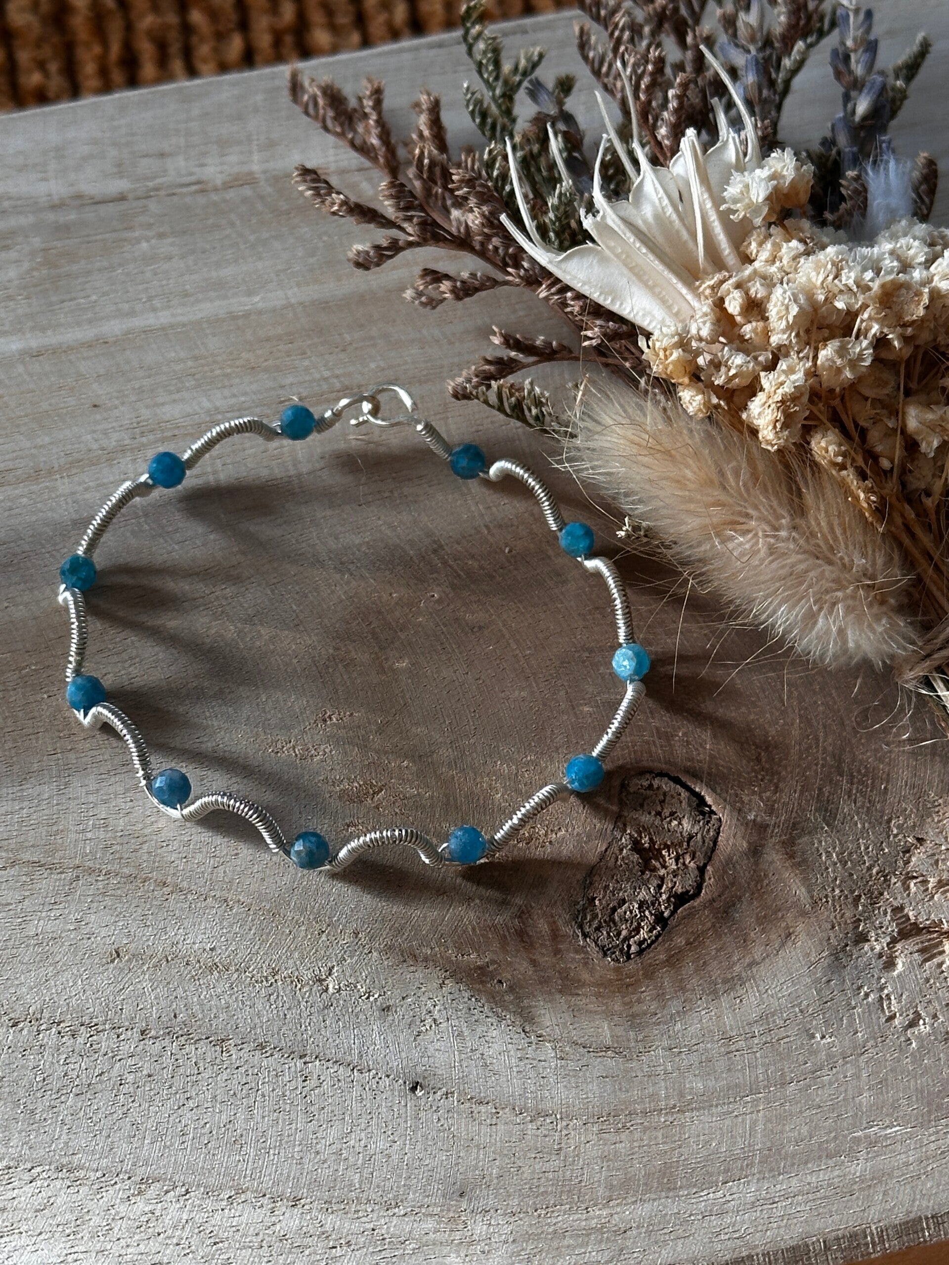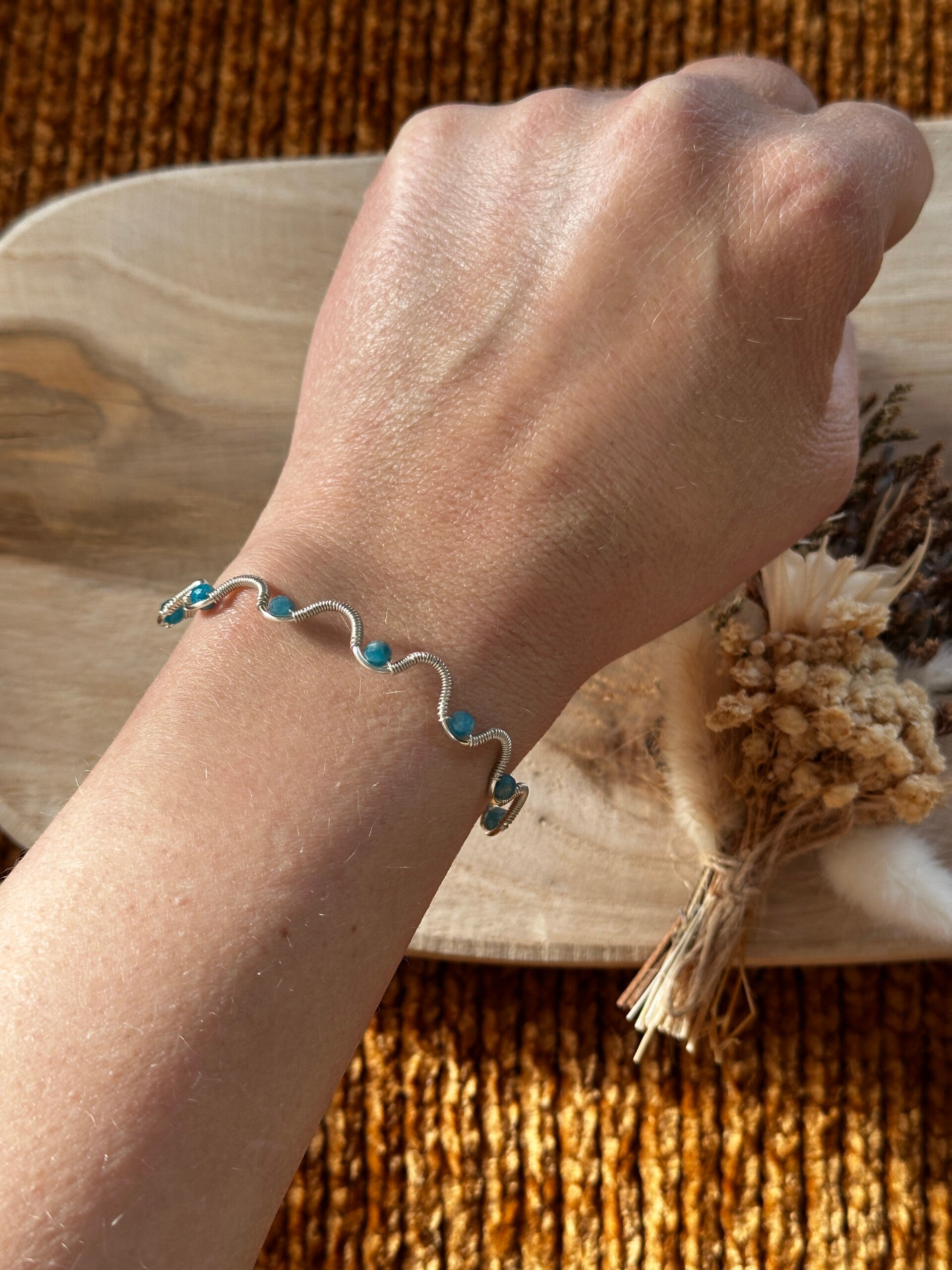 Armband uit zilveren koperdraad met apatiet-kralen. Polsomtrek 17cm.