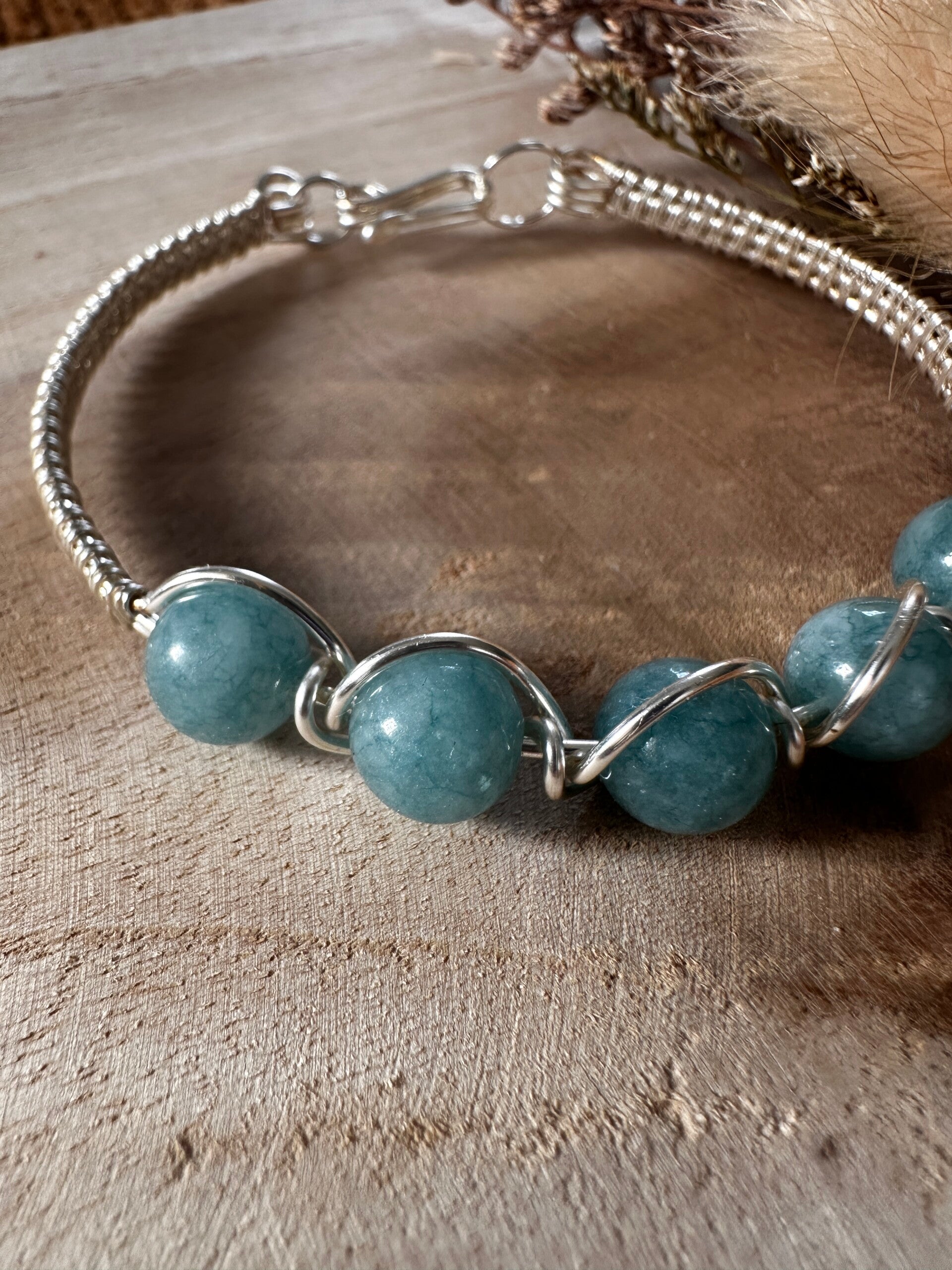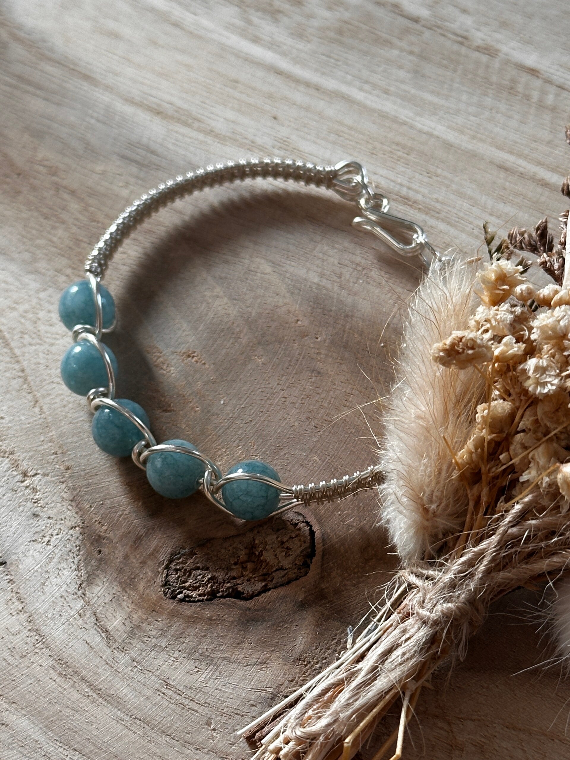 Armband uit zilveren koperdraad met aquamarijn-kralen. Polsomtrek 18cm.