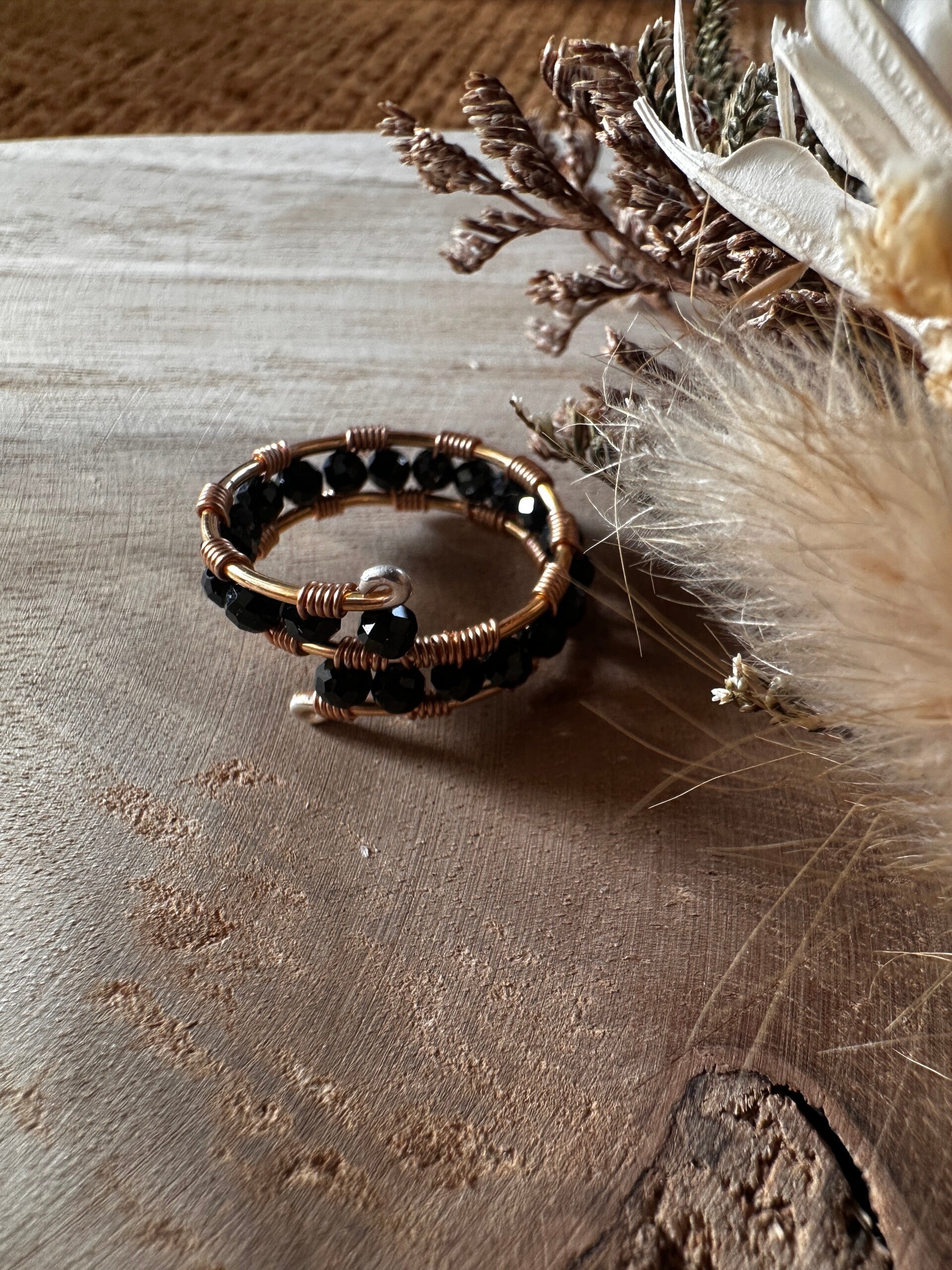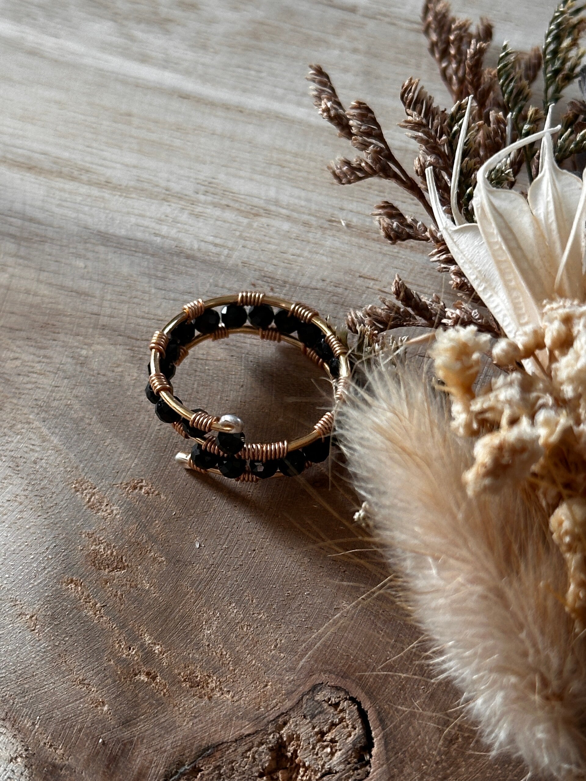 Ring uit gouden koperdraad en zwarte spineel-kralen. Ringmaat 55 (US 7).