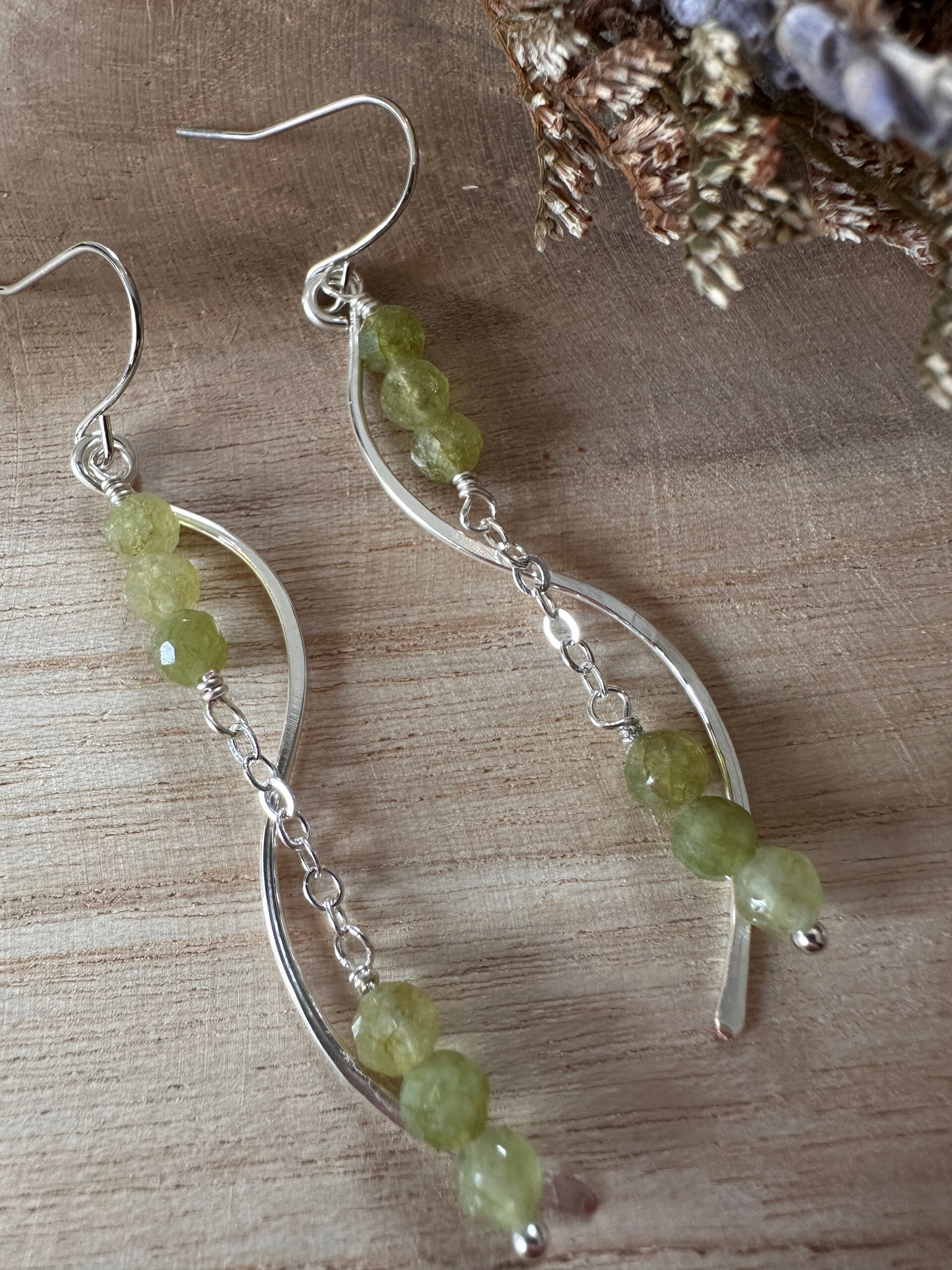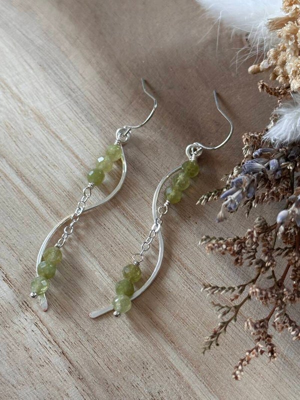 Oorbellen uit zilveren koperdraad en peridoot-kralen.