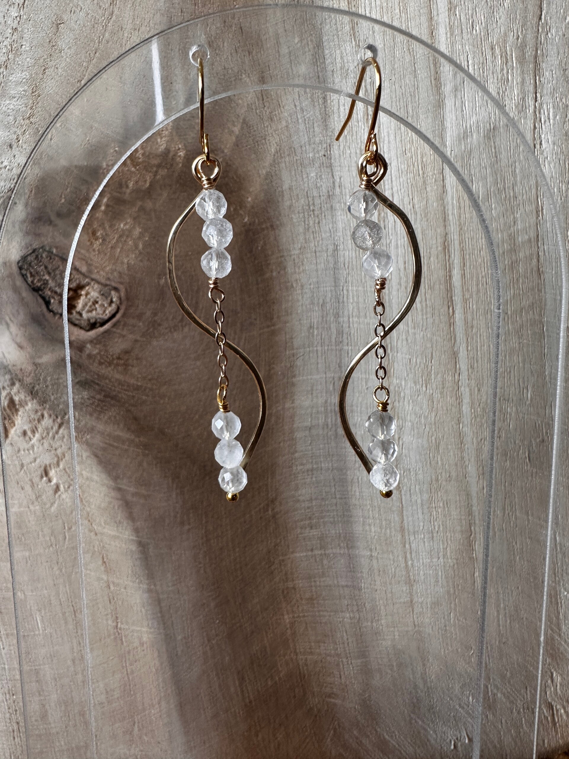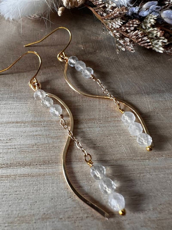 Oorbellen uit gouden koperdraad en bergkristal-kralen.