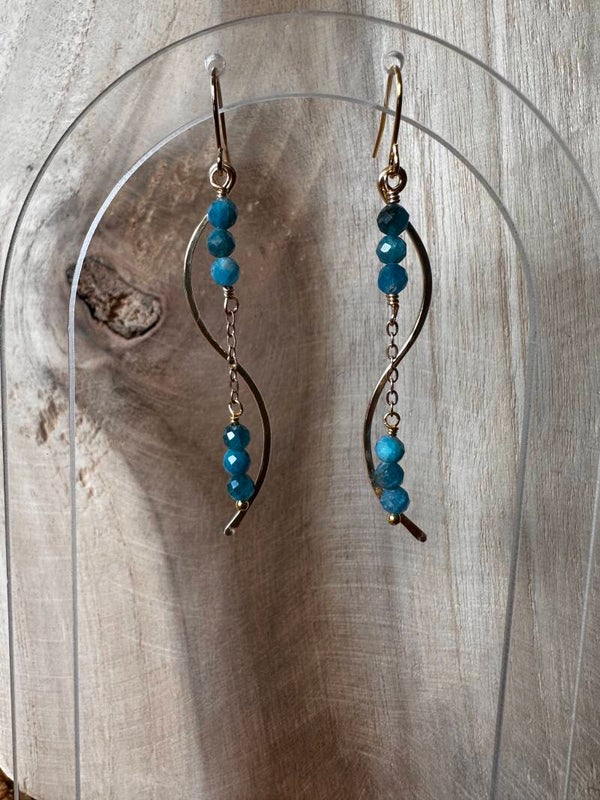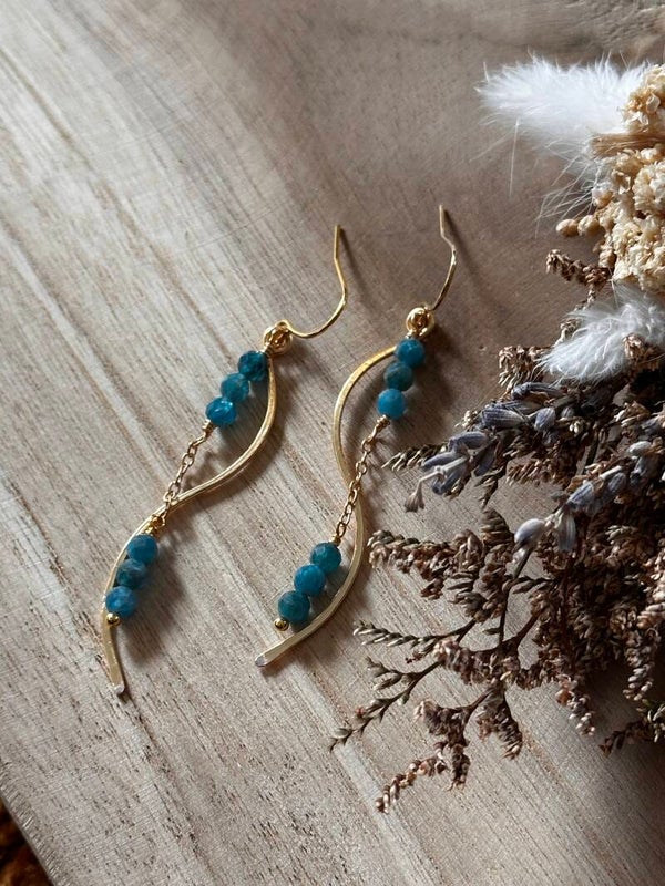 Oorbellen uit gouden koperdraad en apatiet-kralen.