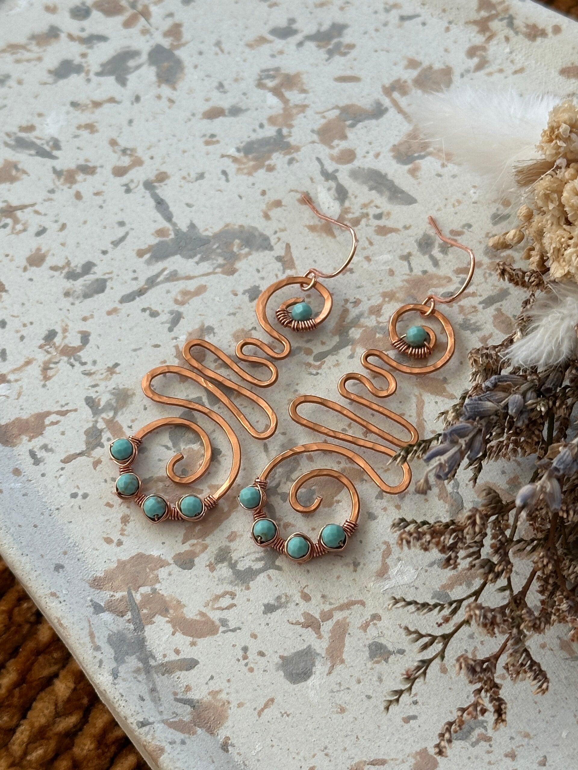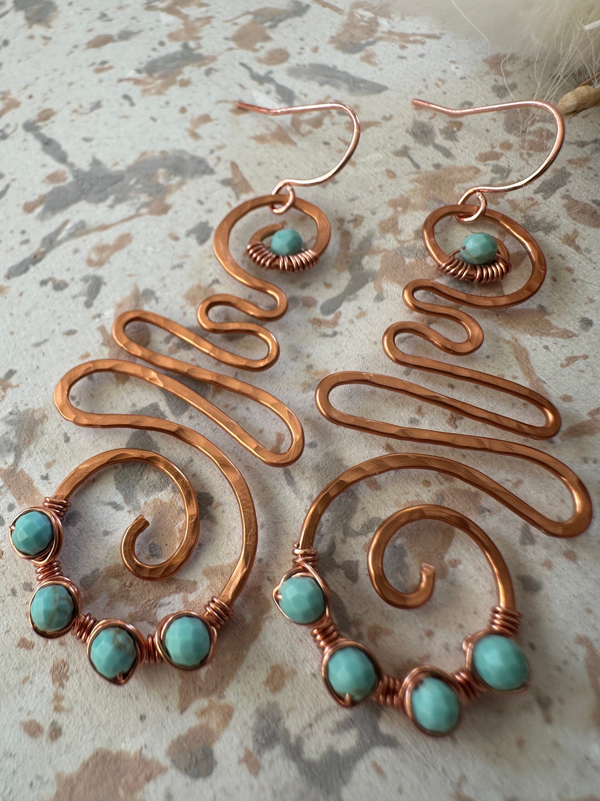 Oorbellen uit pure koperdraad afgewerkt met turkoois-stenen.