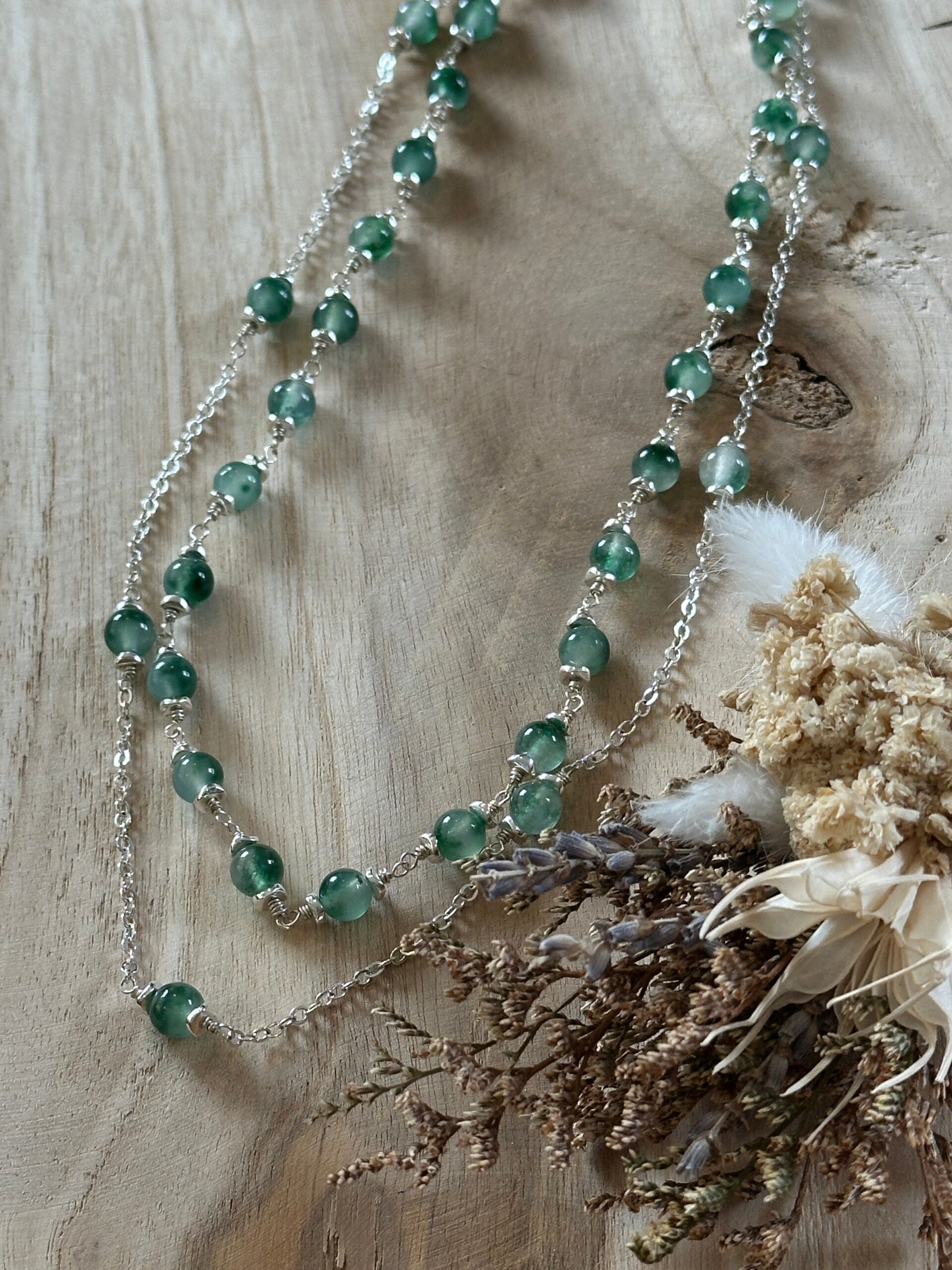 Halsketting met groene chalcedoon-kralen. Zilveren afwerkingen.
