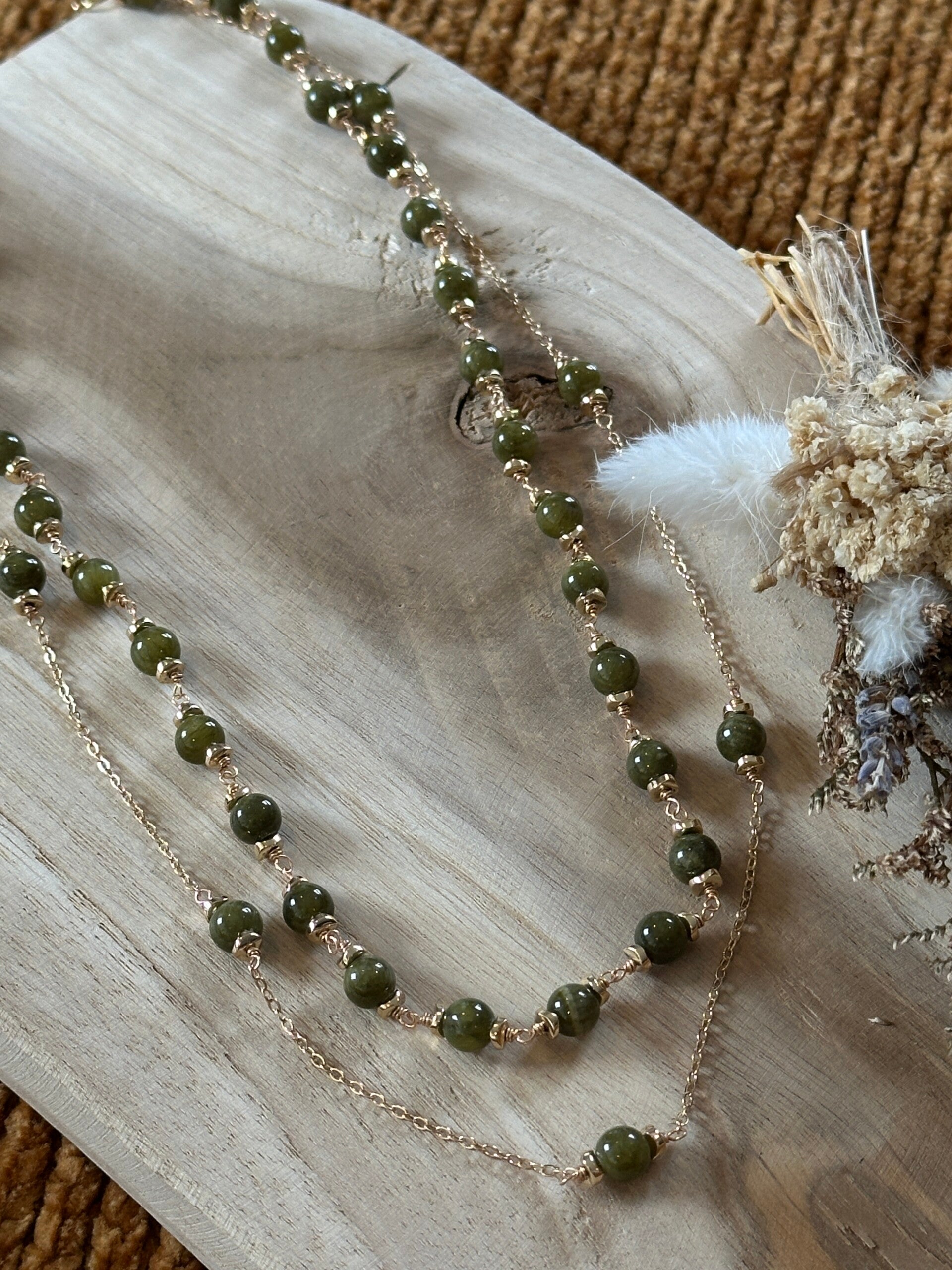 Halsketting met groene jaspis-kralen. Gouden afwerkingen.