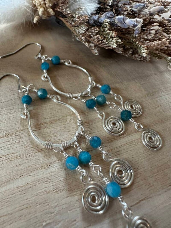 Oorbellen uit zilveren koperdraad afgewerkt met blauwe apatiet-kralen.