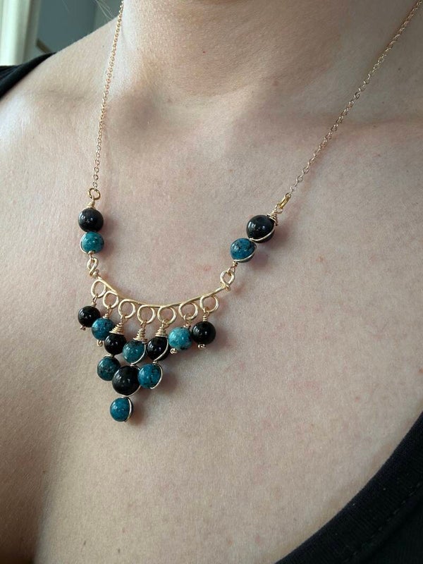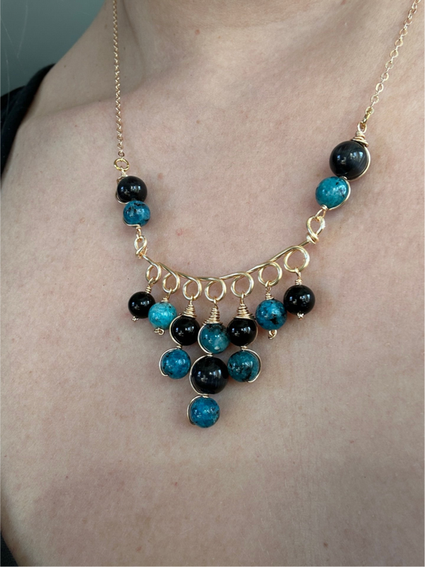 Halsketting uit gouden koperdraad met zwarte Onyx en blauwe Jaspis kralen.