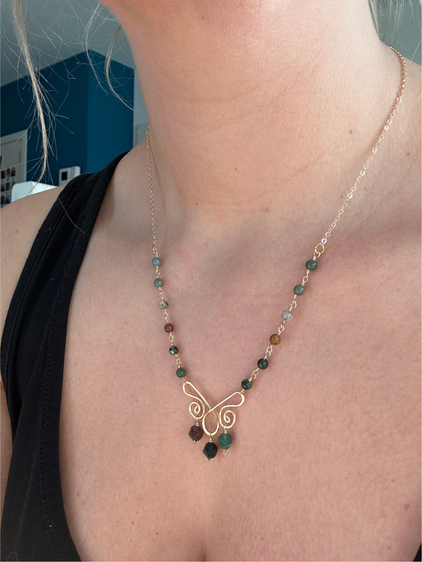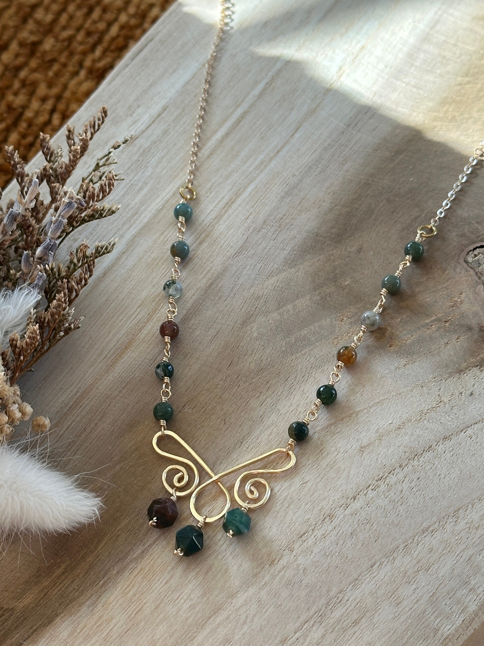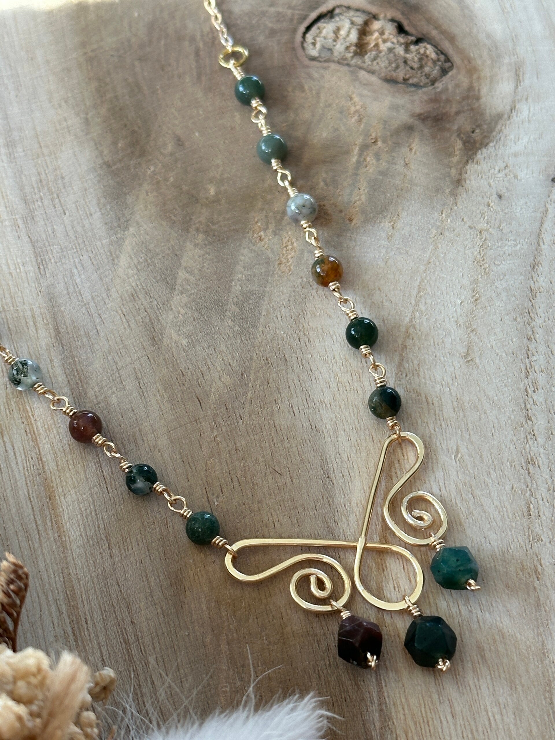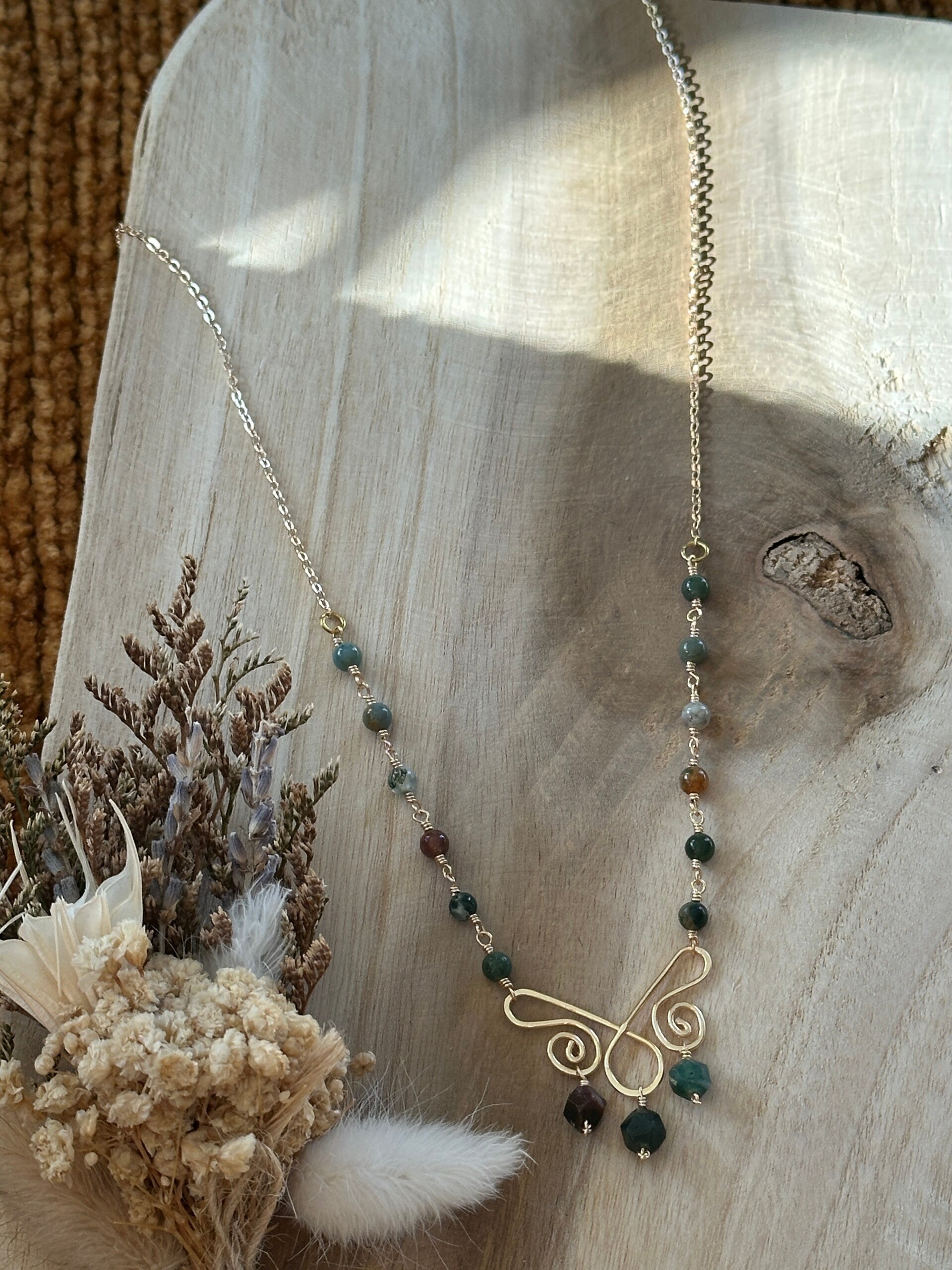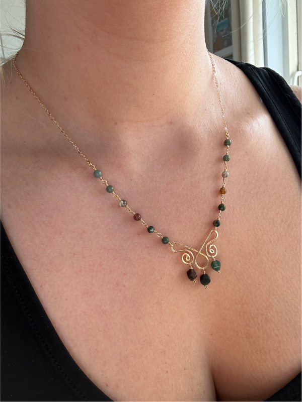 Halsketting uit gouden koperdraad en Indische agaat kralen.